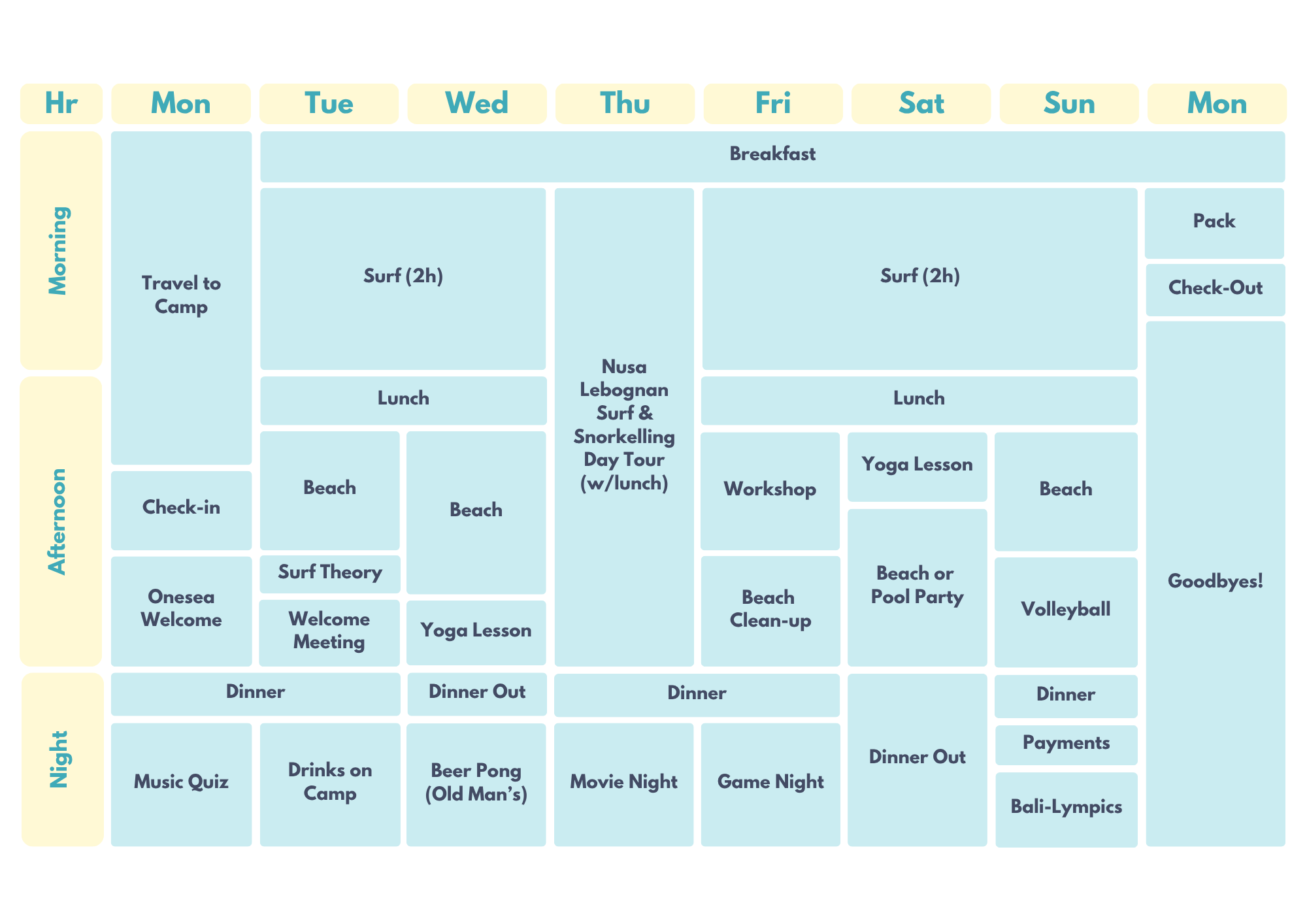 You will have 2 yoga classes to strengthen your core muscles and improve your balance, which is key for controlling the board.