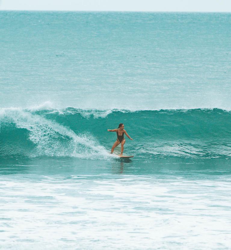 Waking up to the soft sound of palm leaves swaying and waves breaking in the distance. Stretch into your bikini, grab your board, and walk barefoot to the beach - sunrise lighting your path, your heart calm but buzzing with energy. You paddle out, feel the ocean holding you, and suddenly… you're standing on a wave for the first (or fiftieth) time, laughing out loud with pure, wild joy.